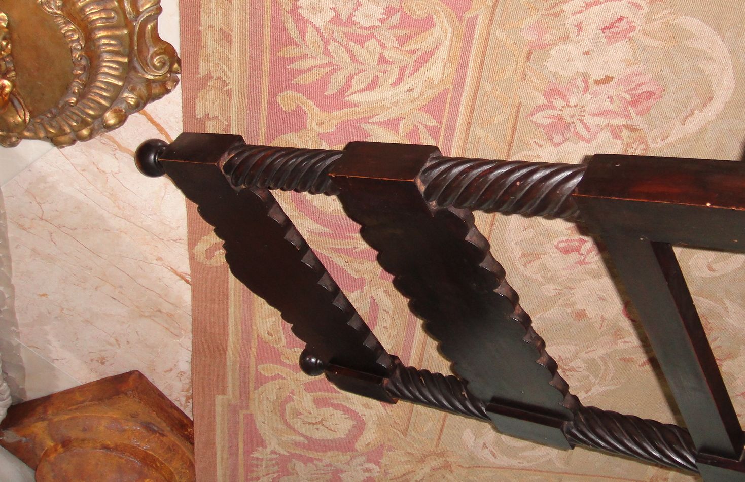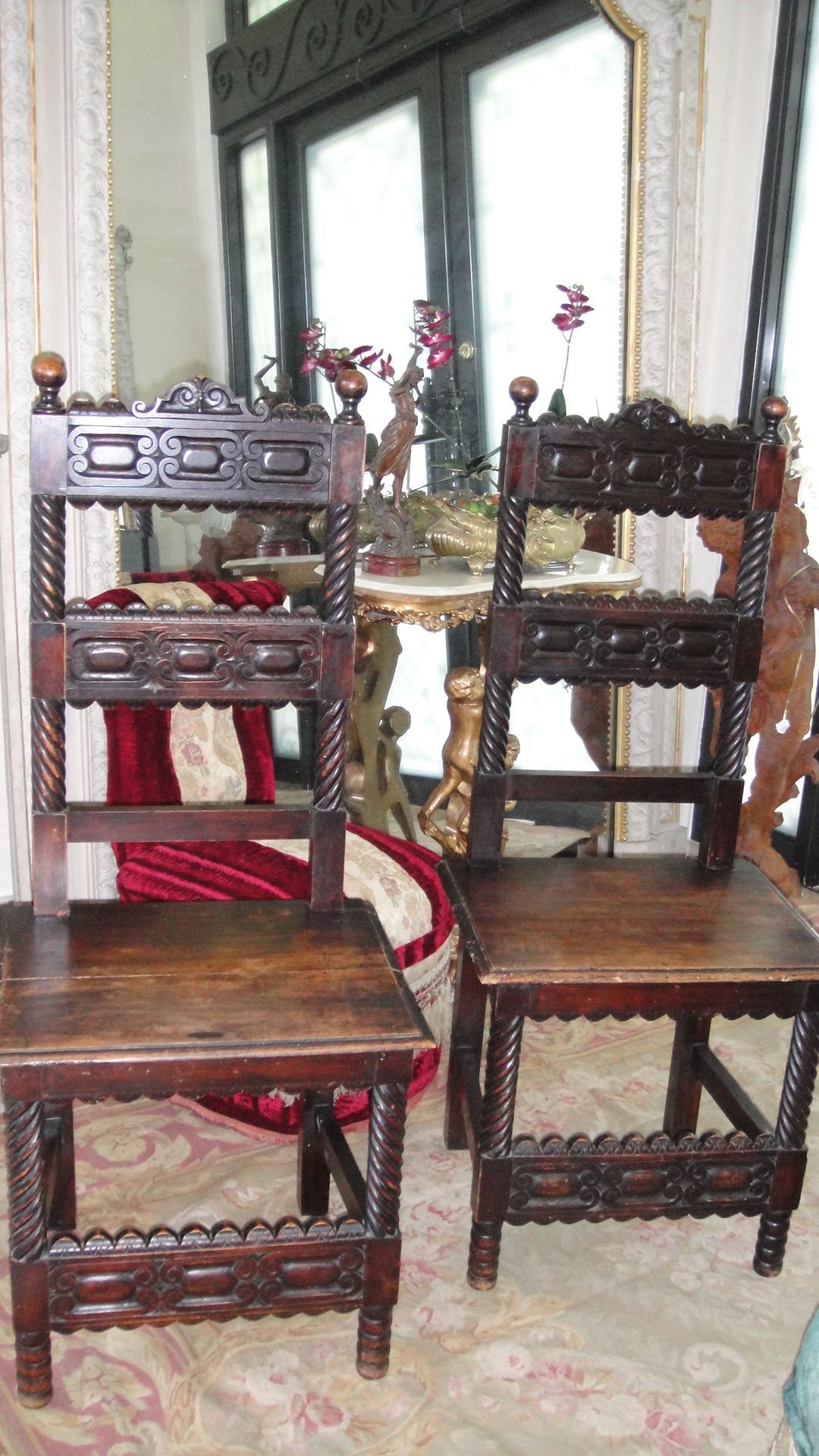 # PRCHR.PG.FUEN.2. Gorgeous Antique French / Spanish Chairs. Circa 1880 and filled at the upper with heavy carvings as well as the high back. In addition the backs having scalloped edges as shown on each photo making them really a rich appearance. Each having a wide seat making it very comfortable for sitting. Each is solid and strong however being so old they have character age marks throughout as shown in photos. Some of the staining has also rubbed off however this is so easy to rub back on. If you notice also the backs having gorgeous spiral columns which truly make them so unique in appearance as well. They having minor repairs but nothing to distract from quality or beauty and they have been well maintained from all the past owners because these are honestly gorgeous gorgeous antique chairs. The the looks alone give them character and then being the seat so wide and large it makes them more appealing due to the comfortableness of them while sitting and in addition with the high back .... they make your back comfortable as well... Just sitting there alone ..the chairs really stand out.