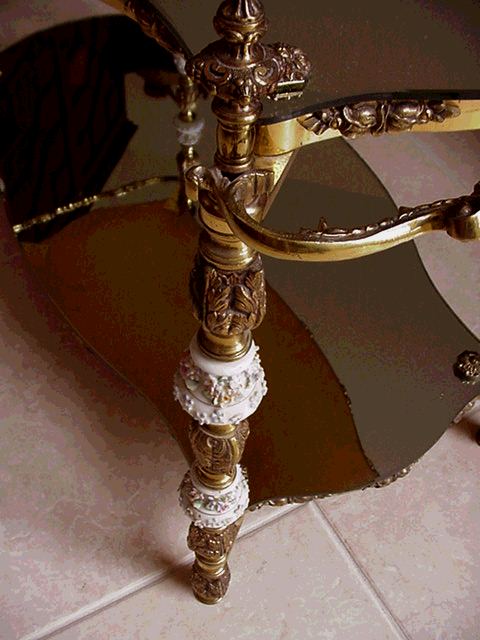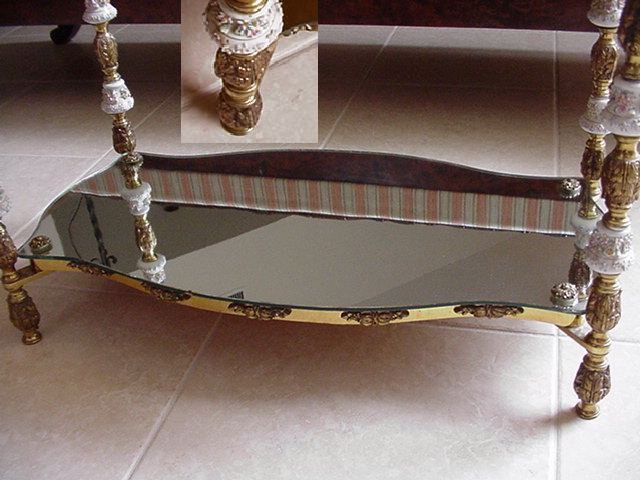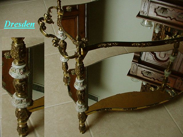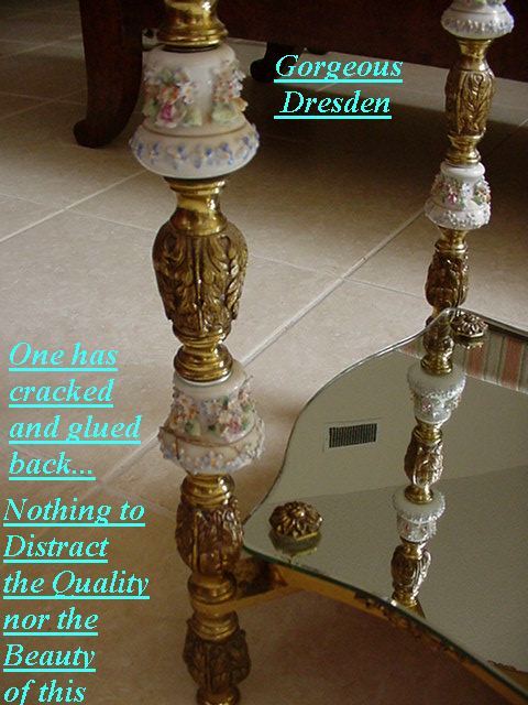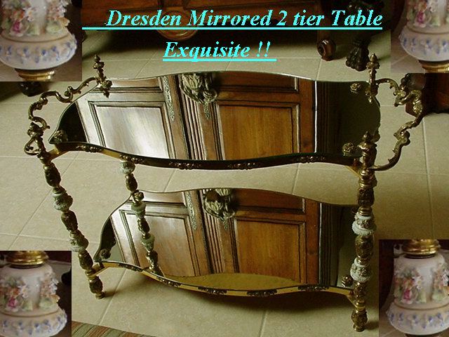 #MM. Rare Beauty !! Dresden Mirrored Table--Gorgeous Dresden sides with Mirrored 2 tier center. Can be used as Serving Table or Coffee Table. From about 1920 with heavy brass ornate sides/upper & base. Dresden from age has been re-glued however this does not effect the quality nor the beauty of this whatsoever as you can see. Unusual Beauty in 2 tier scallop-like curved edges. A Gorgeous Showpiece to any room that nothings compare to this one.