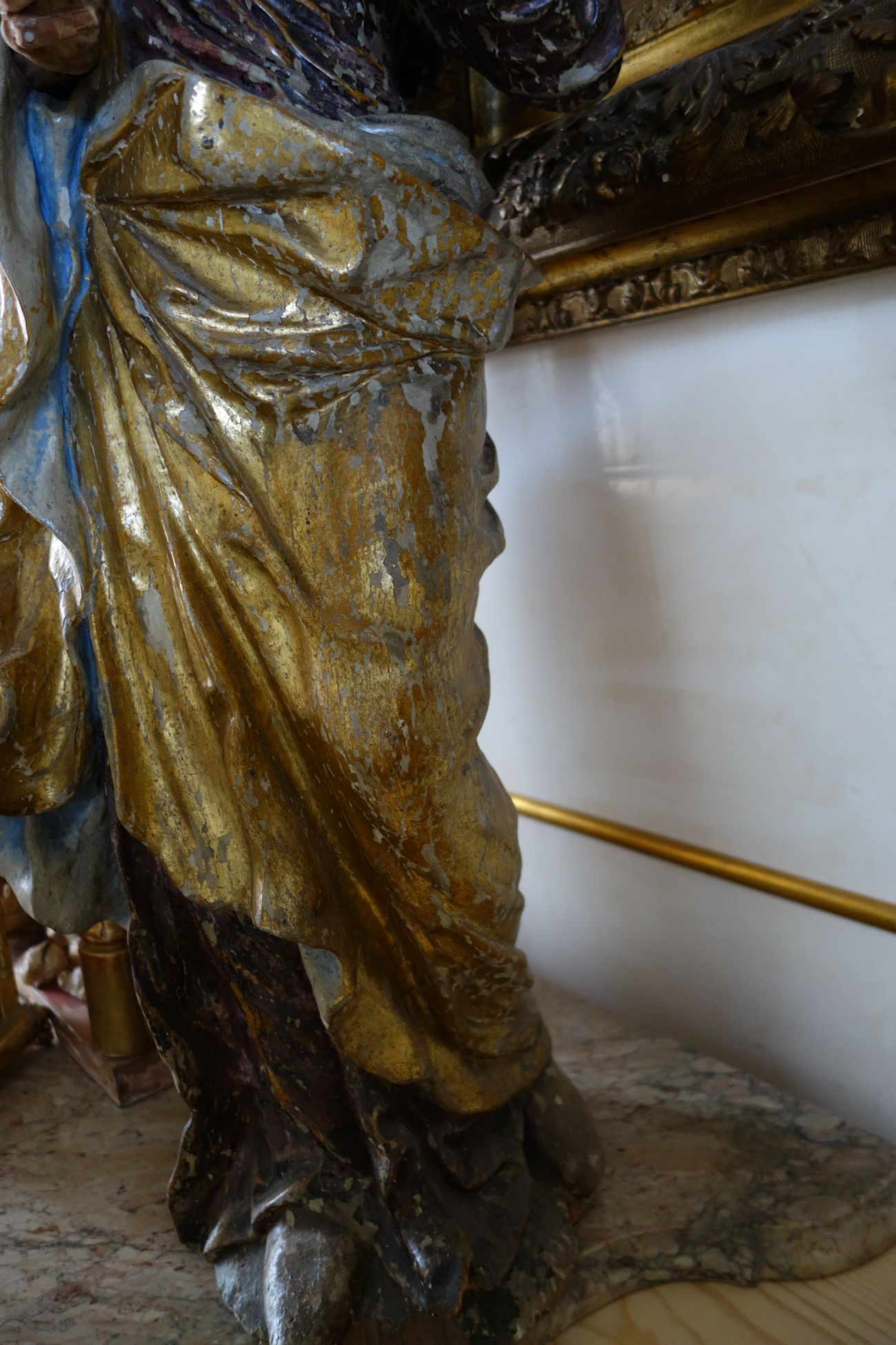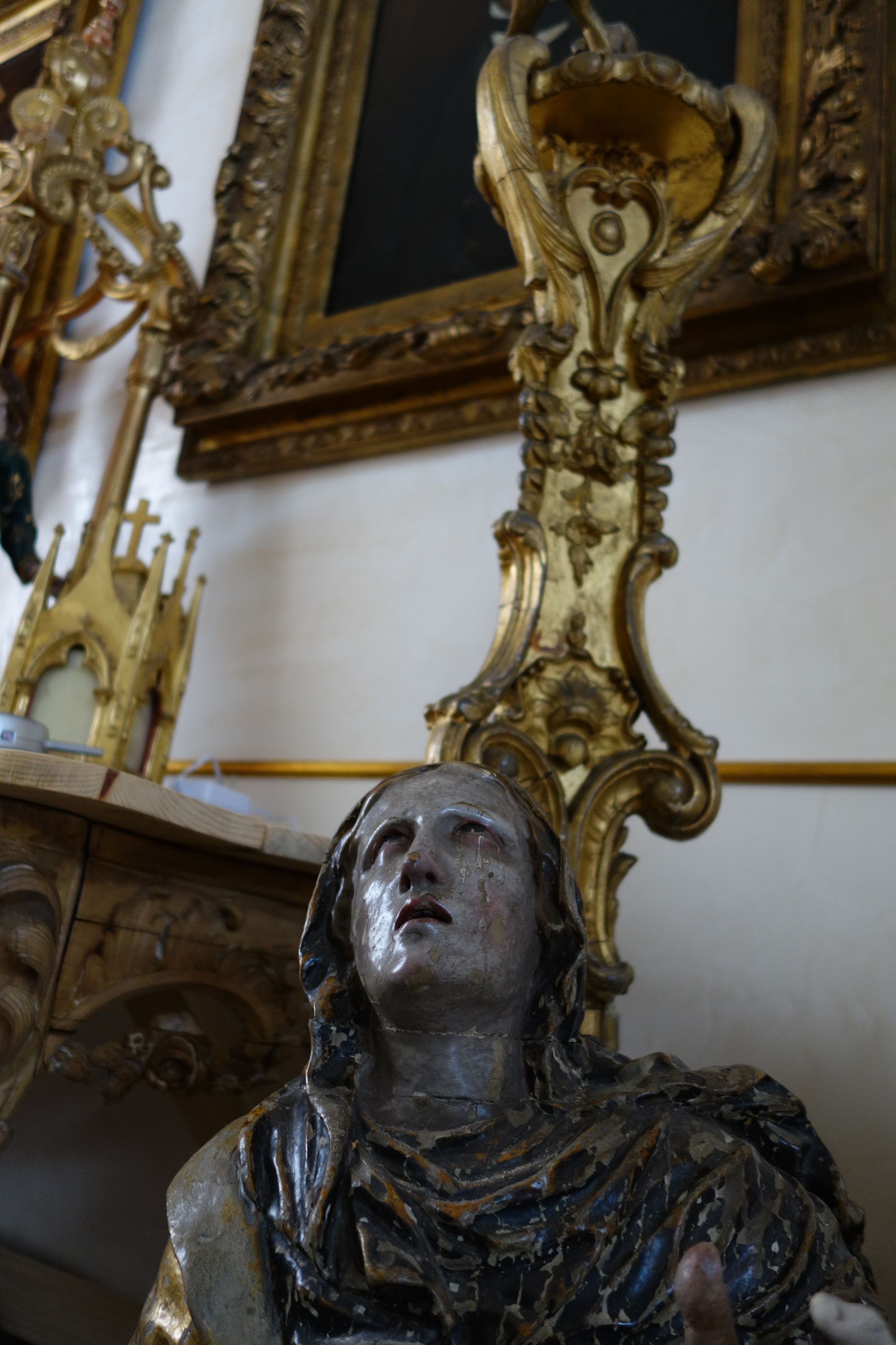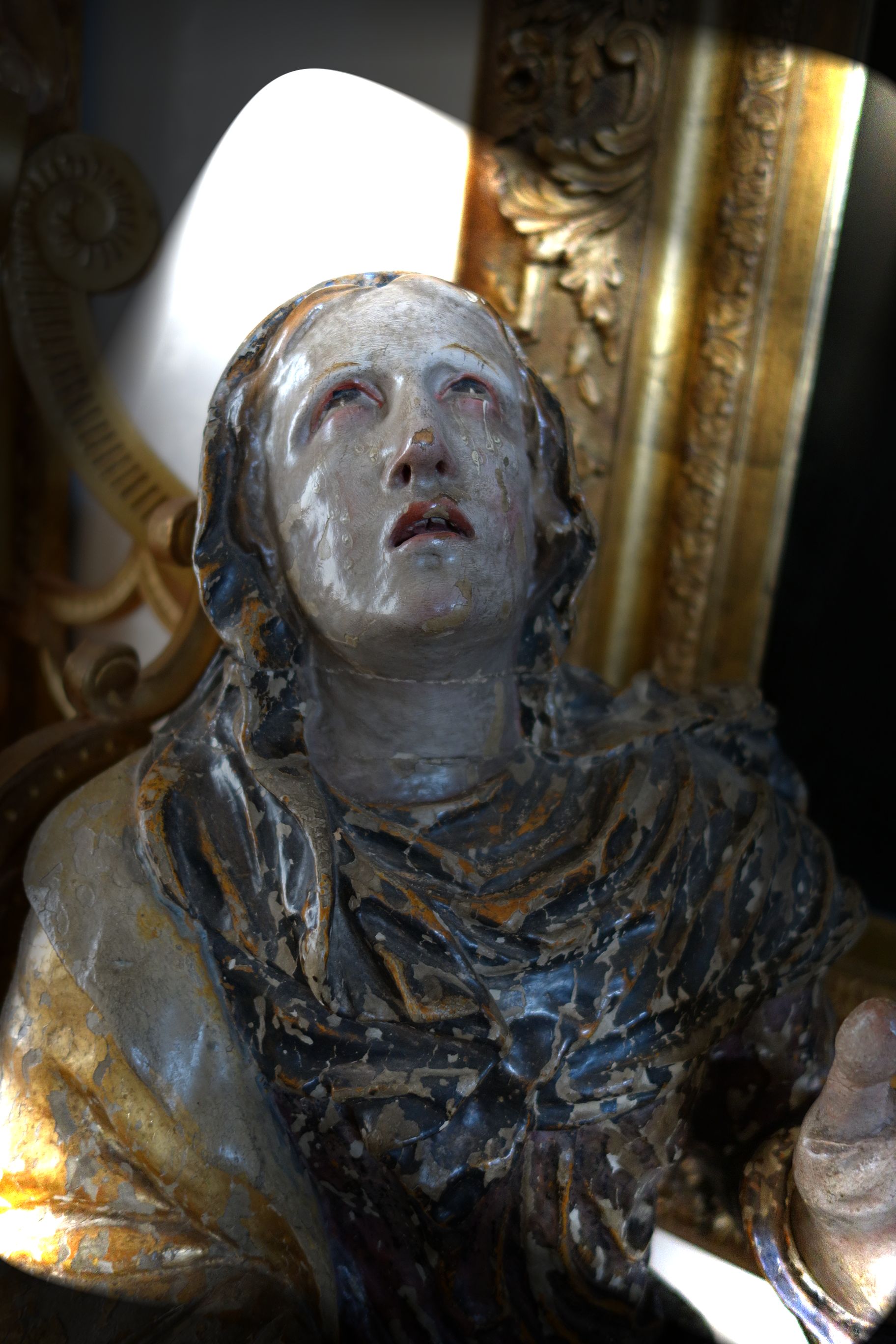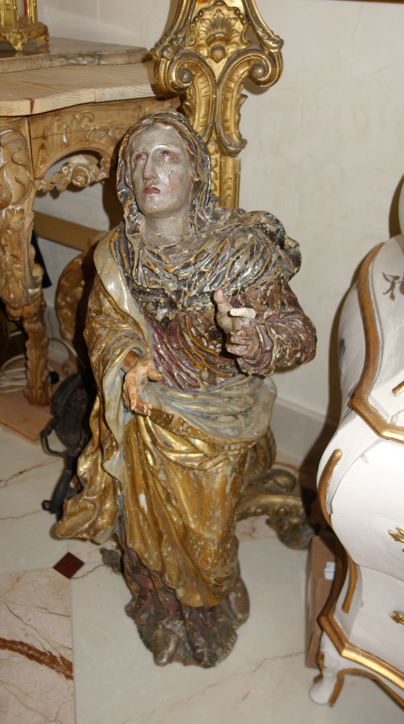Religious3/Madonna. Extraordinary Antique European Hand Carved Weeping Madonna Wood Statue. Intricately hand carved in every detail with extraordinary details given to her facial expression. She is breathtaking in her weeping facial expression. Her carvings in her long flowing gown are again very intricate. One finger was replaced and one full carved hand was replaced from being so old. She remains with her Original heavy hook on the backside where she once hung on the wall to adorn an ancient church in Europe. She also remains with all her Original worn out faded chipped paint and please take notice to her expression with tears coming downward. Opening to her neck area however again natural for her age. A piece is taken out of the bottom front as shown also. She brings warmth and beauty from the past and certainly will continue with you. The backside is carved out which is notable on a higher craftsmanship carving. Circa early 1800's. Photos are part of this description--please see them all for your viewing they are made large.