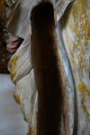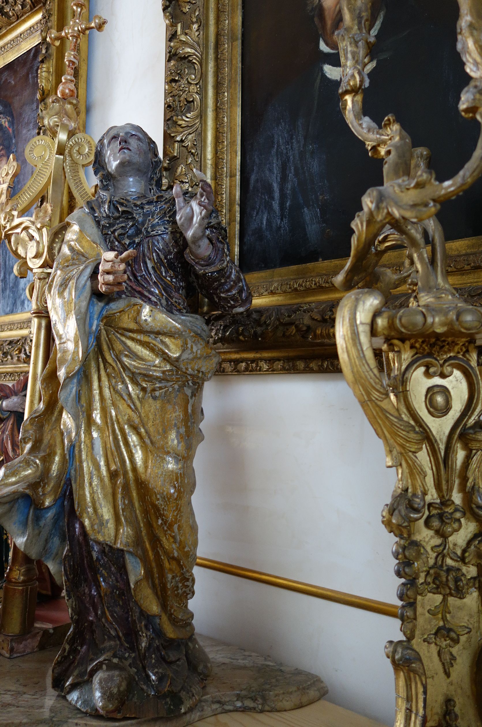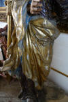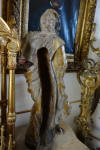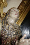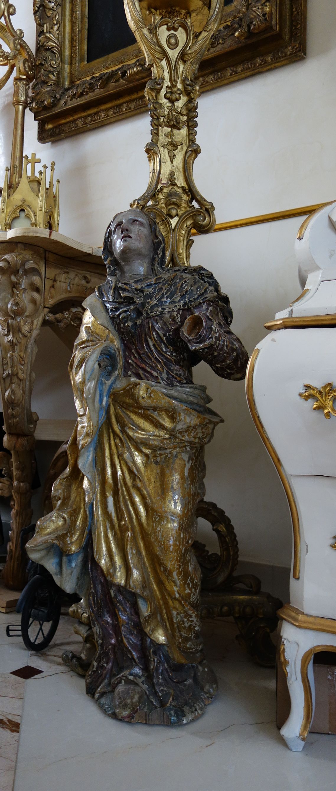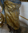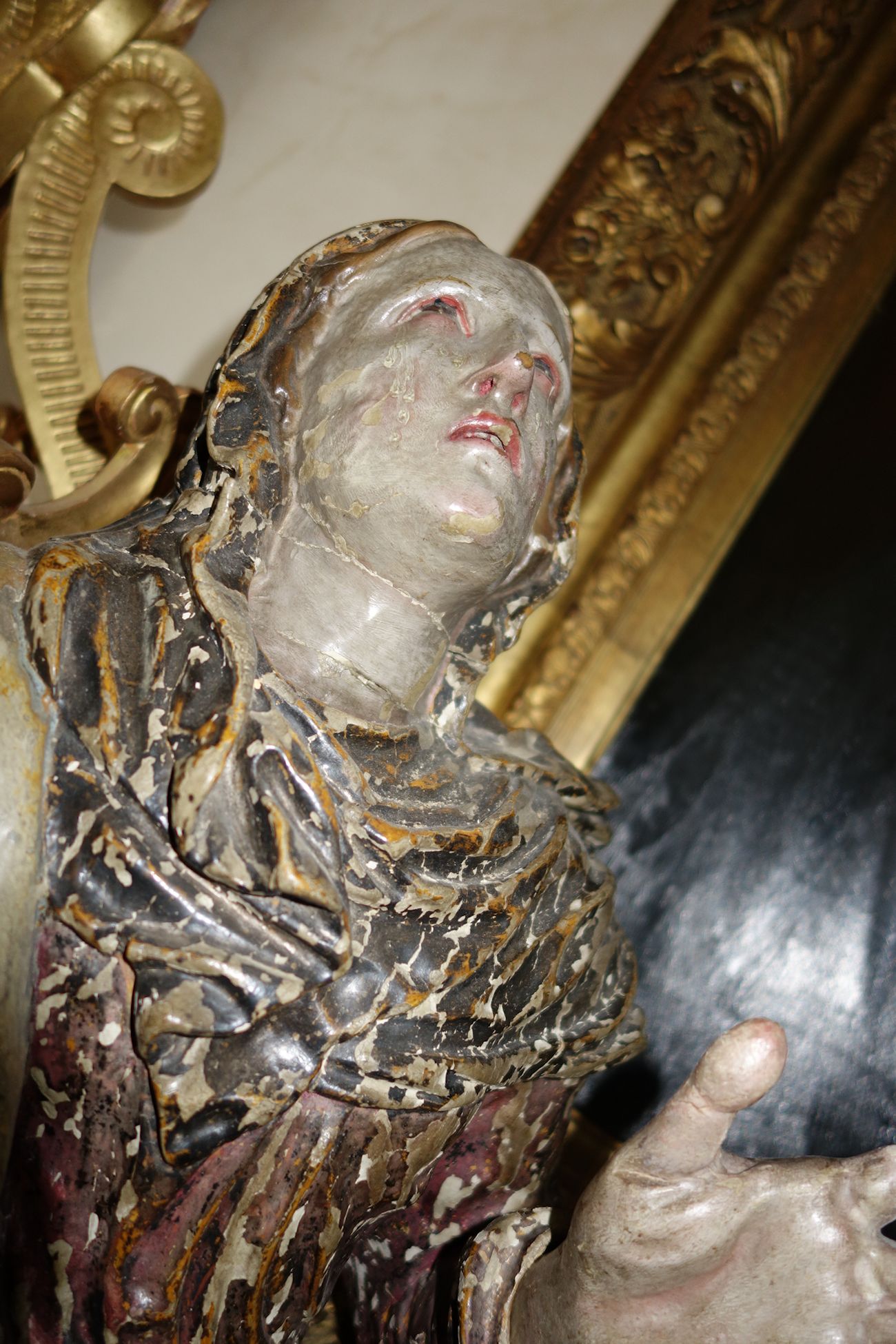 Religious3/Madonna. Extraordinary Antique European Hand Carved Weeping Madonna Wood Statue. Intricately hand carved in every detail with extraordinary details given to her facial expression. She is breathtaking in her weeping facial expression. Her carvings in her long flowing gown are again very intricate. One finger was replaced and one full carved hand was replaced from being so old. She remains with her Original heavy hook on the backside where she once hung on the wall to adorn an ancient church in Europe. She also remains with all her Original worn out faded chipped paint and please take notice to her expression with tears coming downward. Opening to her neck area however again natural for her age. A piece is taken out of the bottom front as shown also. She brings warmth and beauty from the past and certainly will continue with you. The backside is carved out which is notable on a higher craftsmanship carving. Circa early 1800's. Photos are part of this description--please see them all for your viewing they are made large.