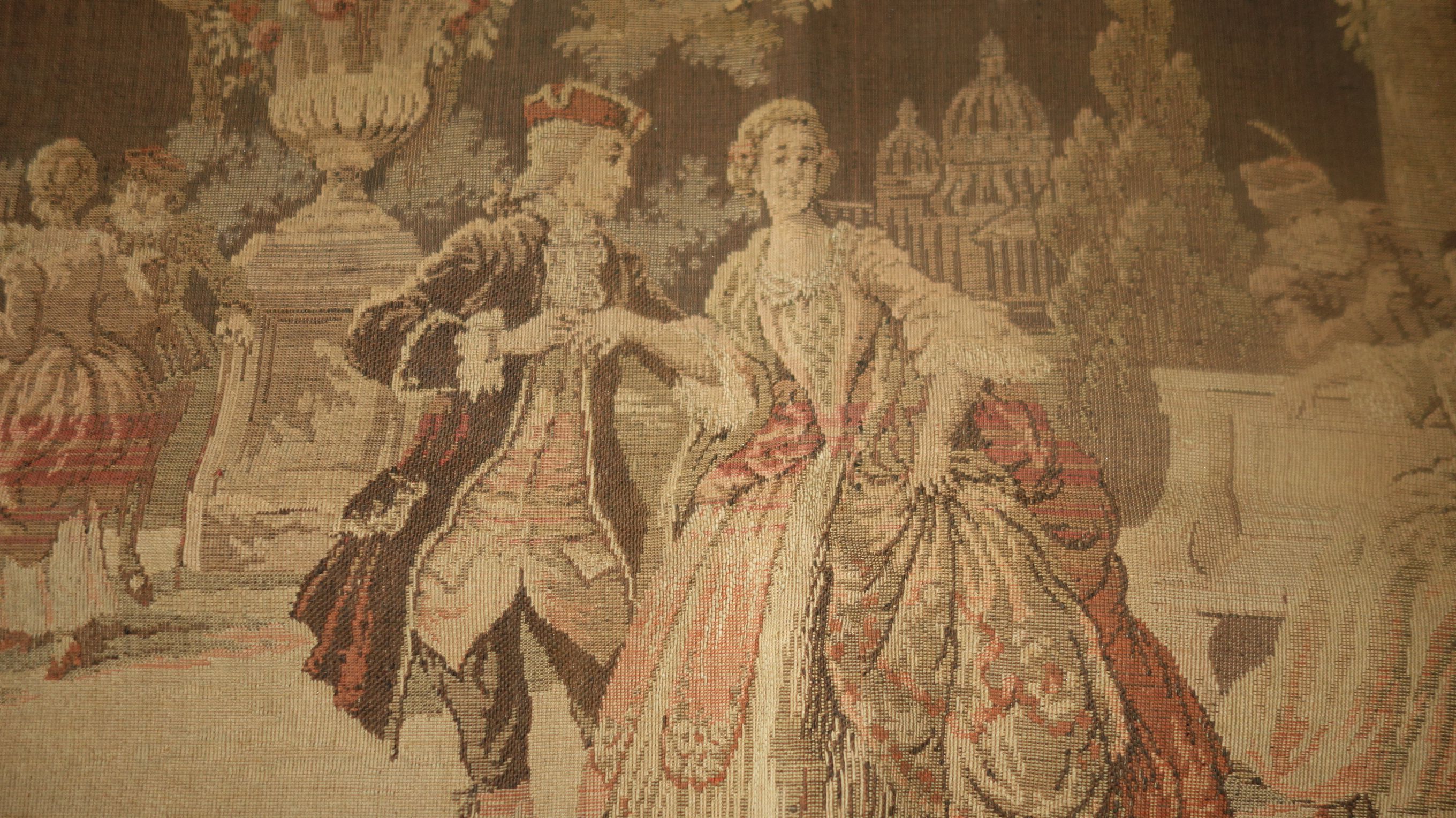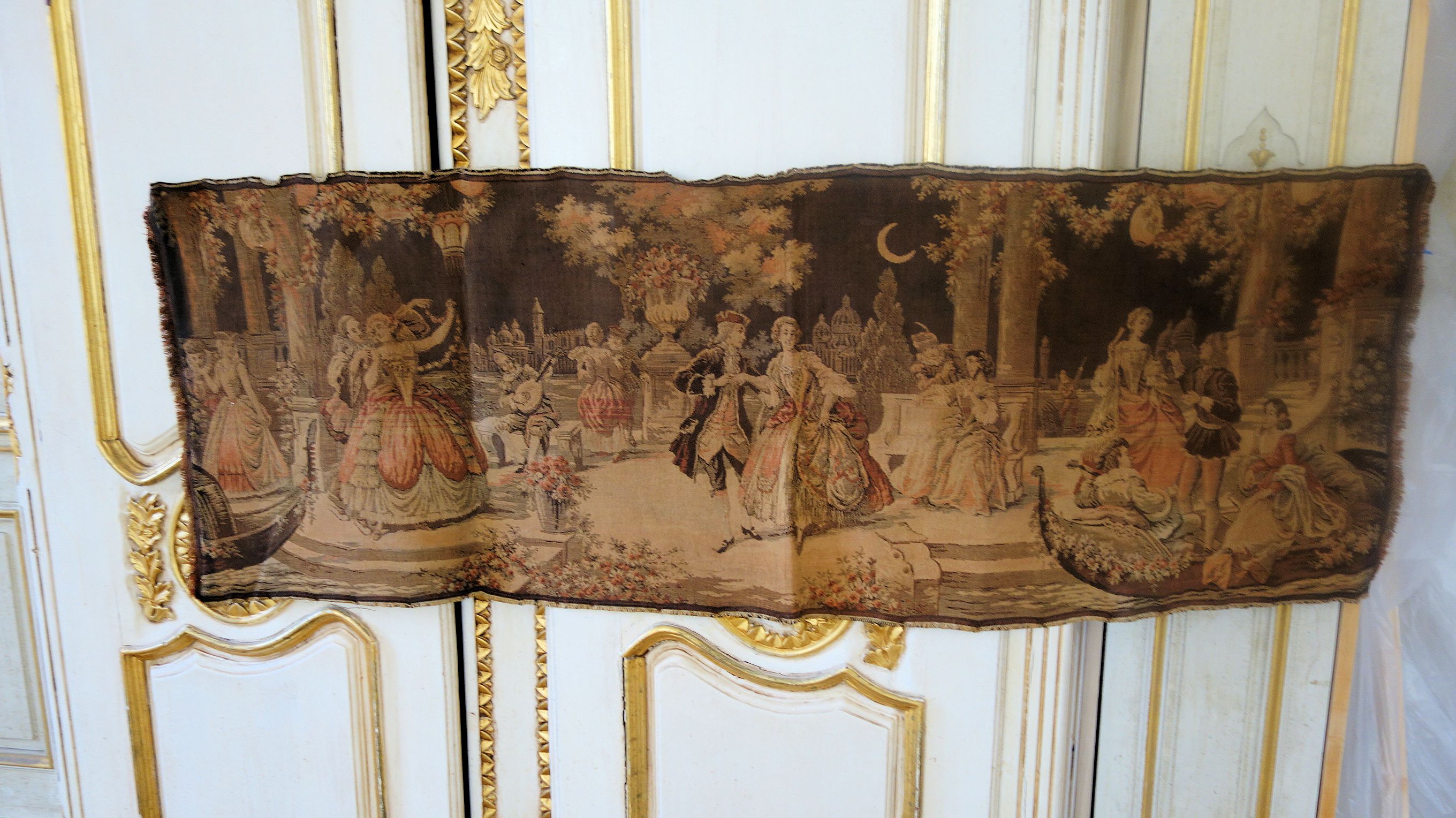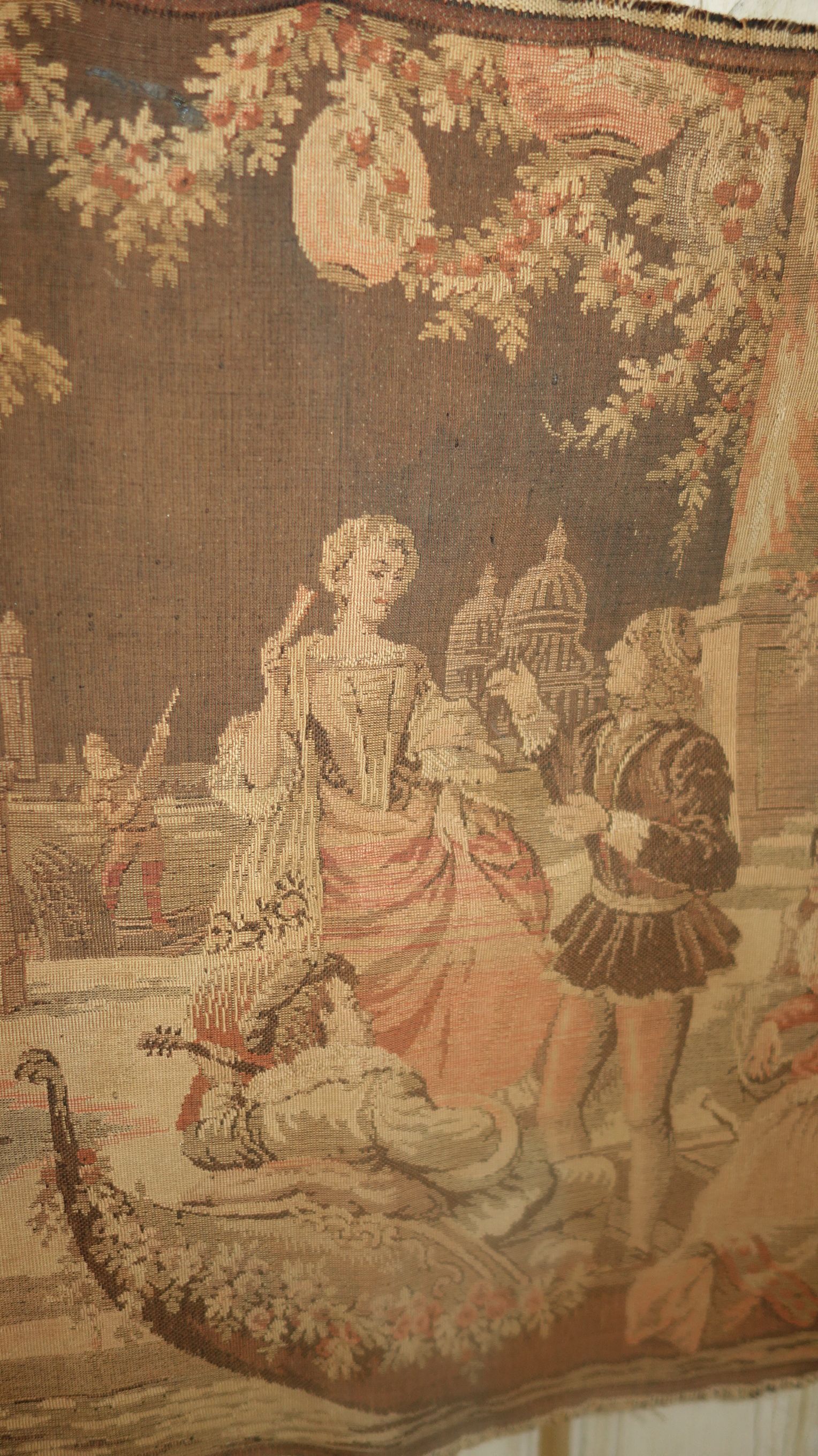 Pg.1. Antique French Tapestry. A great French Antique Tapestry filled with gorgeous figures of French males and females. It remains in beautiful condition from the past and can be either hung using your own rod and by adding/sewing small loops of anything type of fabric to the back and then slide your rod through for a beautiful accent to any wall. The colors are more muted in browns, pinks and more. Its also a great size for any where or perhaps used for a small table throw or make into a pillow--which would be magnificent being the size of this piece.