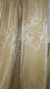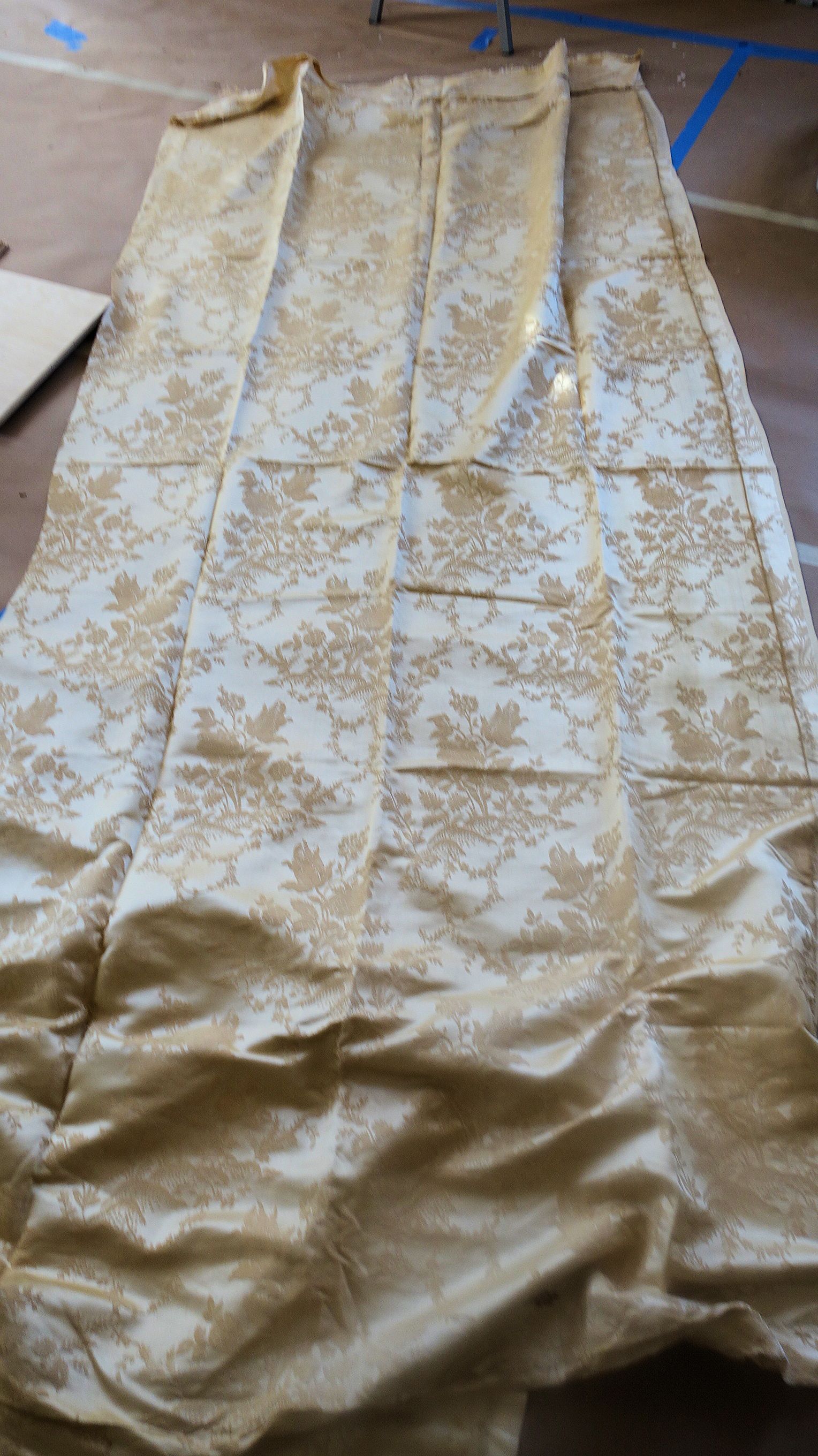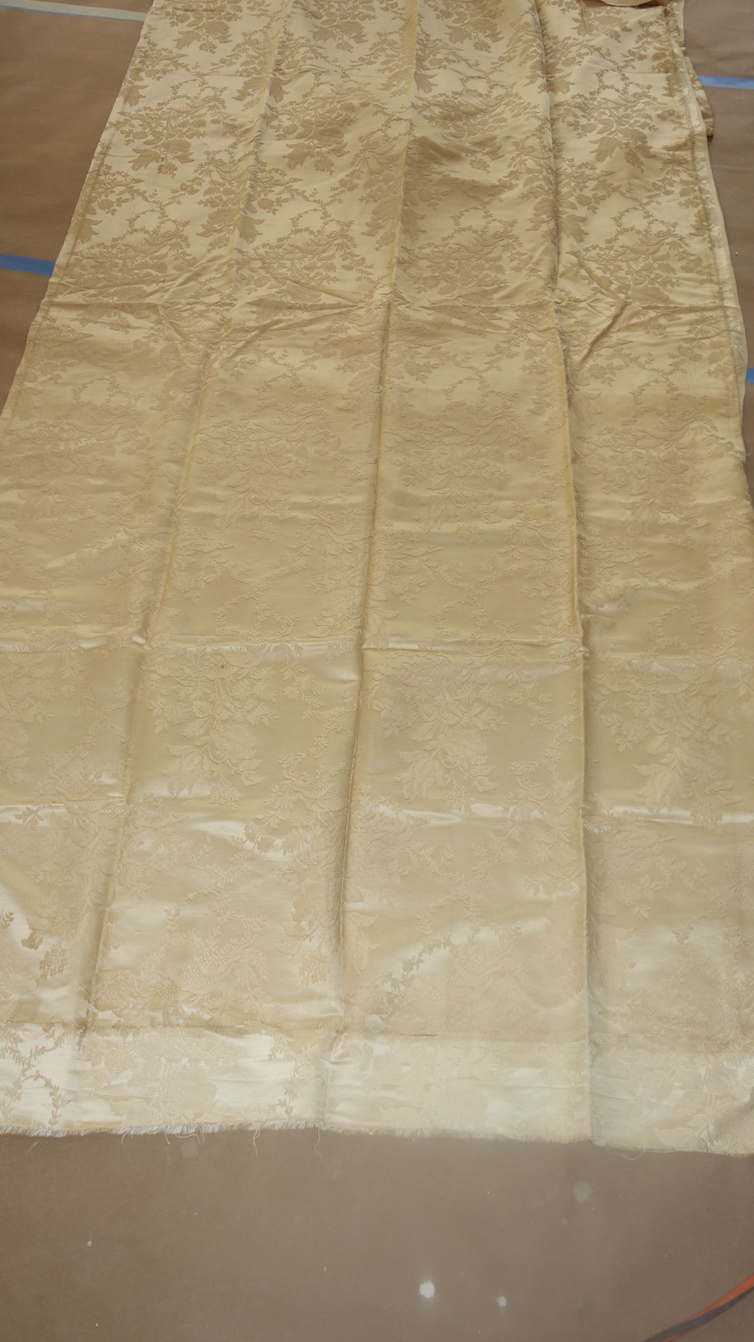 Pg2. Lovely Antique French Silk Brocade Drapes Curtains Panels Fabric. The color and motifs on this French set is gorgeous however it has some issues which are easy to mend. The uppers are straight across and if used for drapes you must add your own rings or gather yourself which is easy. The base hems are removed and where the hems were --there are tears--and soils-- however, you would have to cut this straight across to make even again or repair the holes as shown in photos. There is an addition minor tear at center upper on one of the curtains which can be easily hidden among the folds if used as drapes/curtains. The one curtain has not be cut straight (on the side going from upper to lower) as shown in photos and again would need either to add a small hem on this side or cut straight or add trimmings which would be lovely. Please see my photos as this will explain all I mentioned. There is also a stain near the hem line as shown. & one at upper top. The drapes/curtains/panels remain beautiful in appearance and would certainly adorn any piece or window. You might wish to use as fabric for a fine project. The color is cream and truly shows up magnificent as shown here when hung.